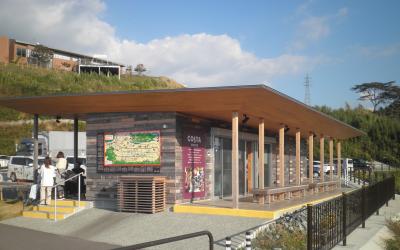 地震で崩落した阿蘇大橋に代わり、場所を変えて新たに設けられた新阿蘇大橋のたもとにある展望所です。駐車場と、テイクアウト専門のカフェやトイレを備えた建物があり、その先に展望スペースがあります。