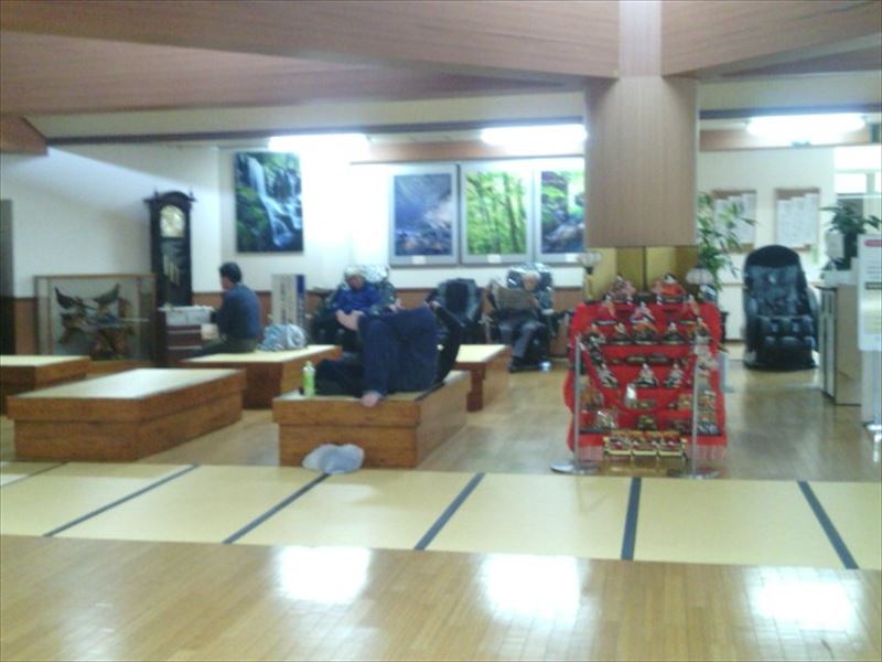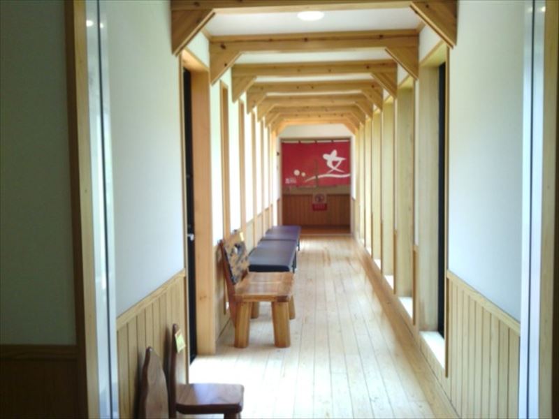 建物は清潔感のある木造で、大浴場と家族湯の間にある中庭もなかなか良い感じでした。畳の休憩室などはなく、受付横に椅子のスペースがありました。
