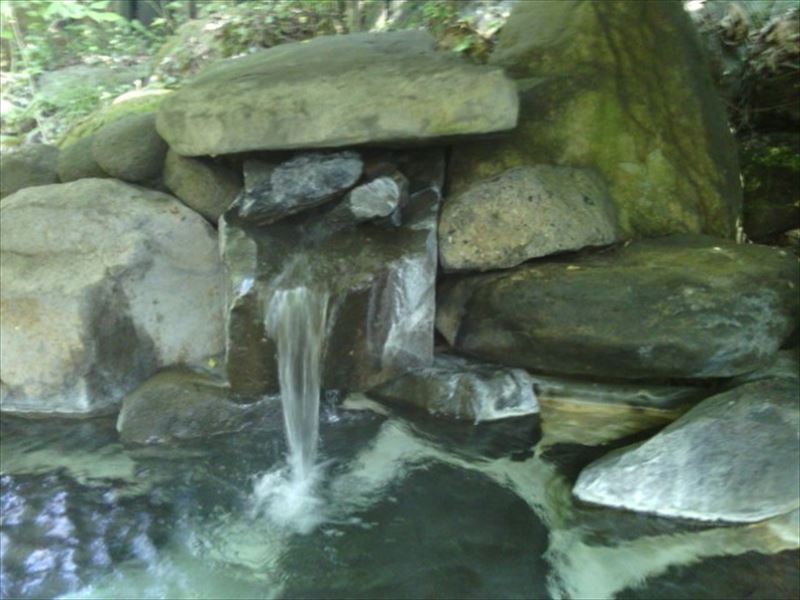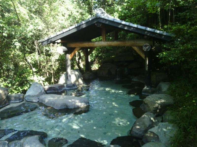 露天はかかり湯があって、東屋付きの岩風呂が一つあるのみ。カランはなく、お湯をくみ出して体・髪を洗います。シャンプー類は備え付けてあって、設備的にはシンプルですが、これはこれで風情があるかな…とも思いました。