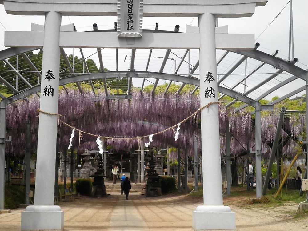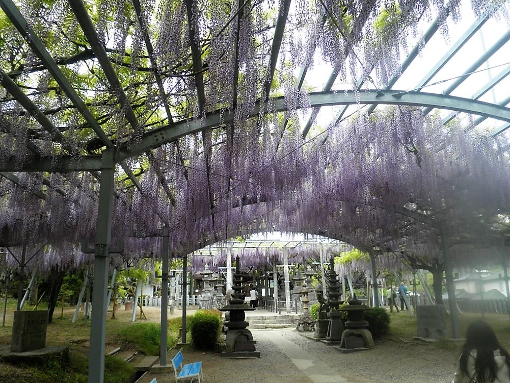 今回、藤を見に訪れました。広い境内いっぱいに藤棚が設けられており、見事な藤の花でした。
