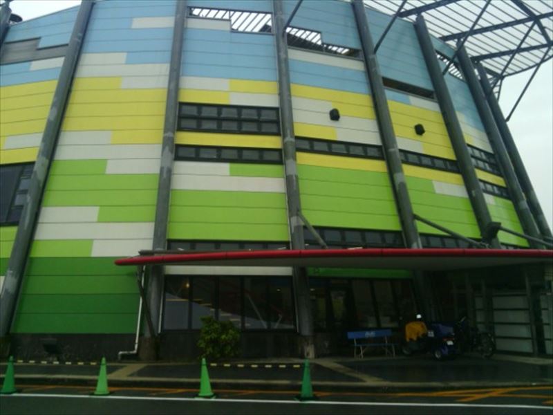 西鉄大牟田天神線から見えるカラフルな円筒形の建物です。温泉施設とプール、食事処などから成っています。