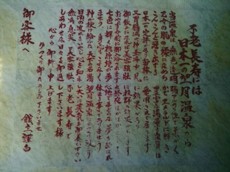 入口はそれほど広くなく、ロビーはこじんまりしたイメージ。午前中のチェックアウトが終わった時間帯なので館内も暗かったのですが、受付の方に周湯券を渡して、大浴場まで案内していただきました(ちょっと奥の方にあります)。