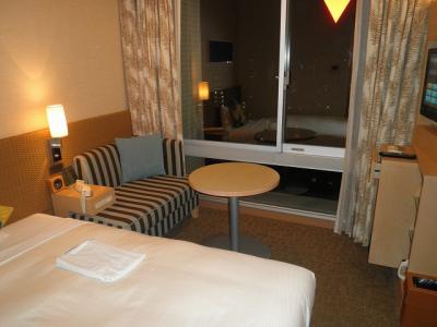 ソファはそれほど大きくないものの、窓際に配置され、ゆったりくつろぐことができました。ただし、デスクがないので、デスクワークには不便かも知れません。(ソファも沈み込むタイプではないし、大きめのテーブルがあるので、ある程度のデスクワークは可能です)