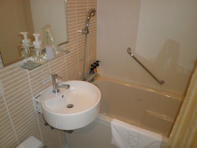 窓側に独立したバス、そしてトイレと洗面スペースがあります。水回りは快適でした。ただし、バスタブは小さくて、あまりゆったりと入れる感じではありませんでした。むしろシャワーブース的に使った方が良いかも。