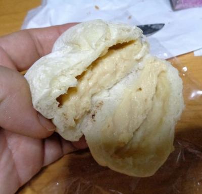 たまころはクリームパンですが、やわらかい生地の中にふわふわのクリームが入っています。普通のクリームと違ってカスタードのようなもっちり感があり、甘すぎないクリーム。