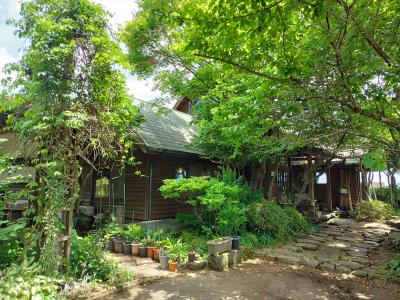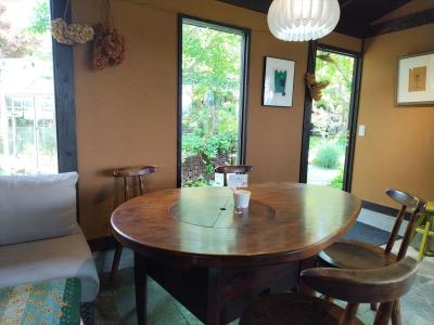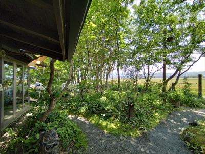 穏やかな田園風景の中、カフェは木々に包まれたようで、緑がまぶしいほどでした。