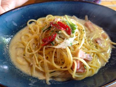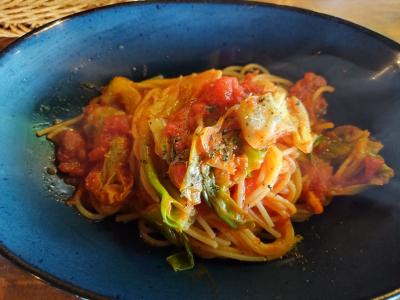 「春キャベツとベーコンのパスタ トマトソース」は、トマトの酸味が効き、また「ゴボウとベーコンのパスタ ピリ辛クリームソース」はゴボウの食感がアクセントになり、唐辛子のクリームソースに良くあっていました。