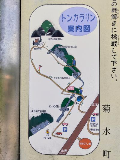 「タンタン落とし」と呼ばれる最も下の部分はホタル公園(道の駅きくすいの向かいのコンビニやホテルの裏側の公園)の最奥にあり、そこから農地の中の道を上がるやや広めの道に出てそこに説明板や簡単な地図が表示されています。
