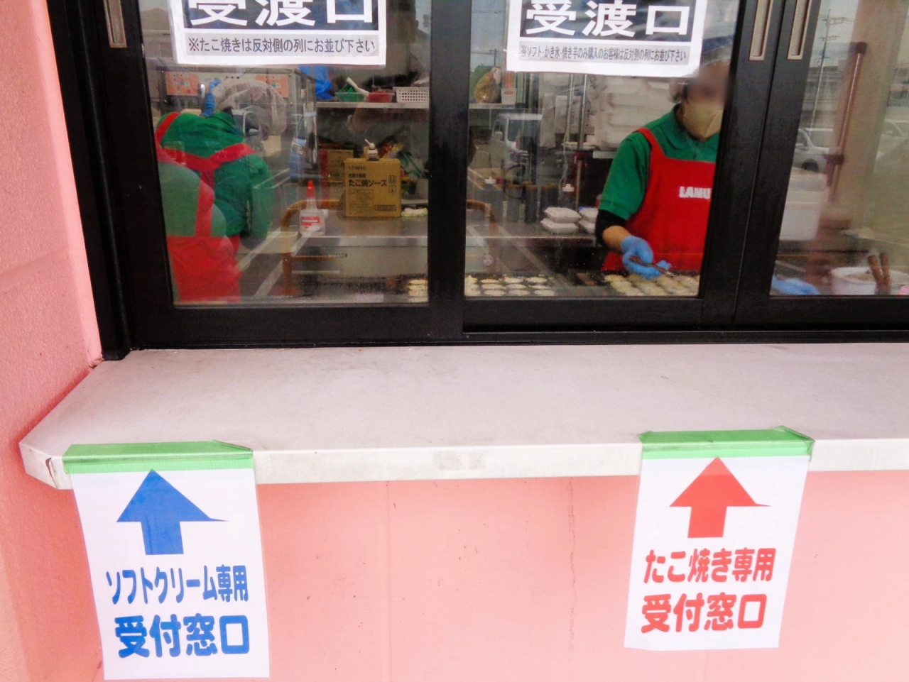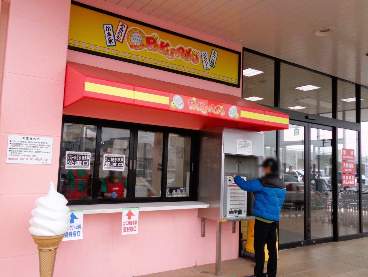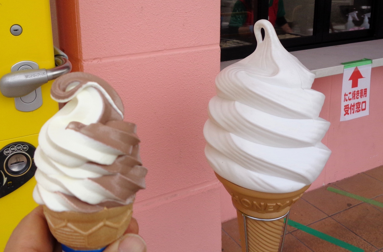ソフトクリーム(バニラとチョコのミックス)を購入しました。やや小さめではありますが、このお値段なら大満足。たこ焼きも人気があって、土日などには待ち時間が必要なときもあります。