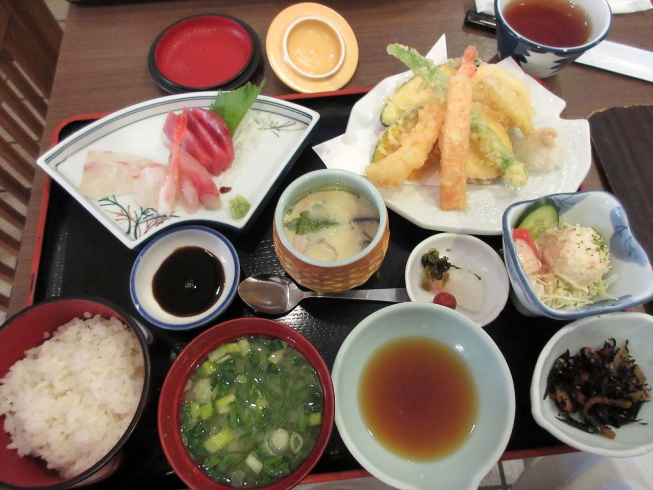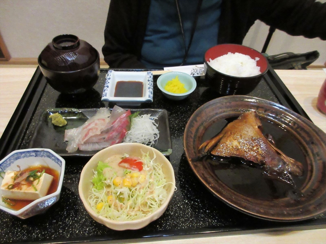 日替わりランチと天ぷらランチを頼みました。日替わりは刺身とぶりの荒煮。荒煮はあぶらがのったぶりに甘辛いタレが絡んで食欲が進み、そして刺身が大きくてコリコリとした新鮮なもので、とても美味しかったです(お店のスタッフの親戚の魚屋さんから良い魚を廻してもらっているとのこと)。