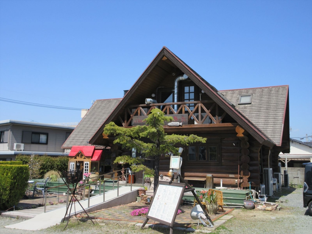 店舗は山小屋風。入口で靴を脱いで中に入るスタイルです。入口以外は段差もほとんどなく、また外からのアプローチもスロープに手すりがあって、バリアフリーにはかなり配慮されているようです。