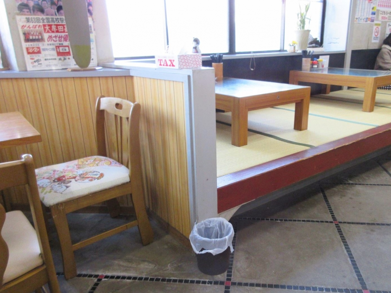 店内はもう長く営業しているような雰囲気。カウンターにテーブル席に小あがりの座卓の席があります。土曜日の昼ということもあると思いますが、店内はほぼ満席、帰り際には待っている人もいました。