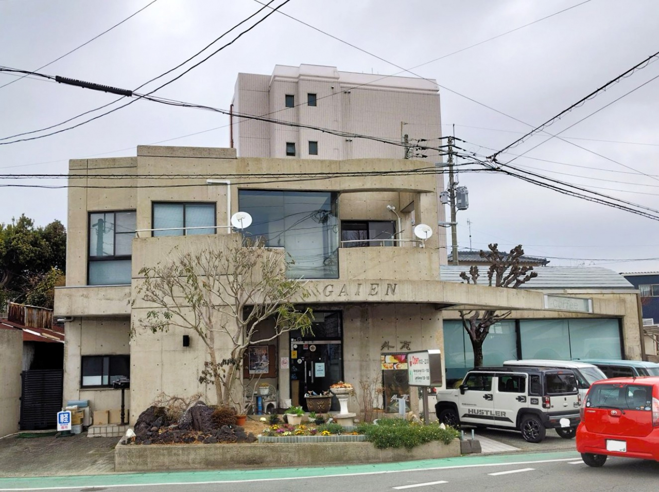 ビルの一階が店舗になっており、すぐ横が駐車場になっています。