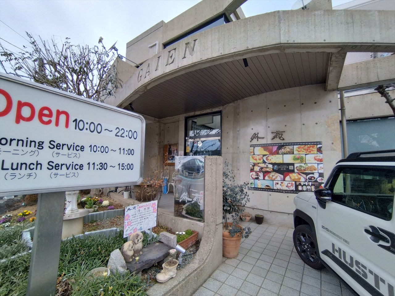 車は店舗前に広いスペースが確保されています。表の通りから入り込んだところにありますが、侵入口に案内板が出ています。