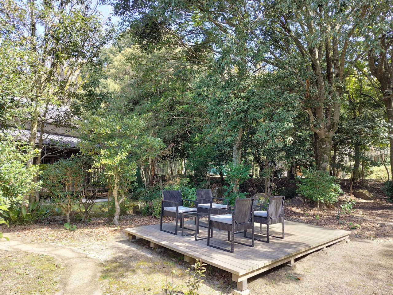 緑に包まれた築百年の古民家が美しくリノベーションされており、とてもお洒落な空間です。