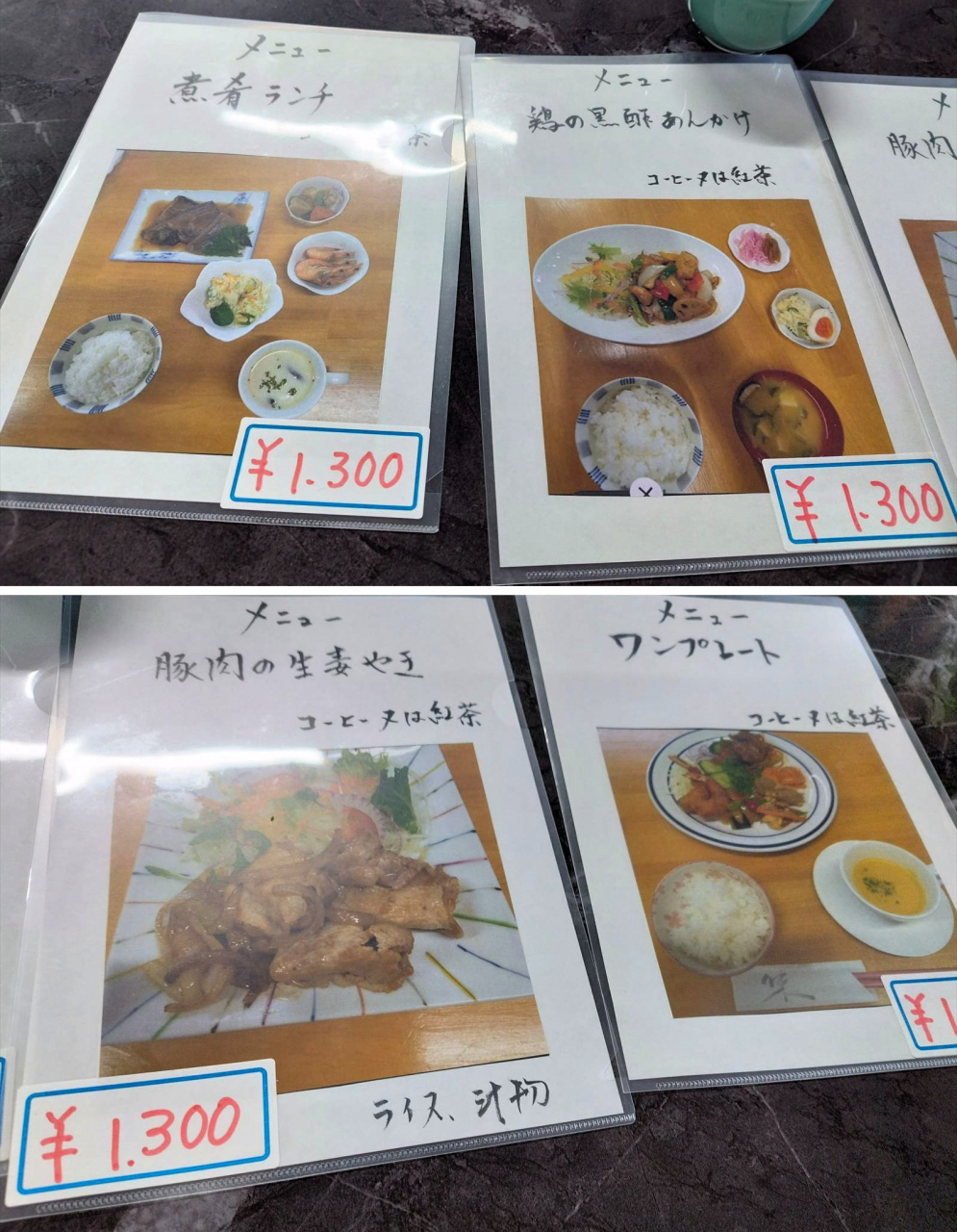 利用したときには、ランチは三種類(税込1300円)。トンカツ、鶏肉の黒酢あんかけ、焼魚の三種類から選ぶ形で、また好みの二種類が半分ずつ入ったワンプレートのランチがあります。メニューは店に用意してあったのと若干違っていたので、その日の食材などによって変わるようです。