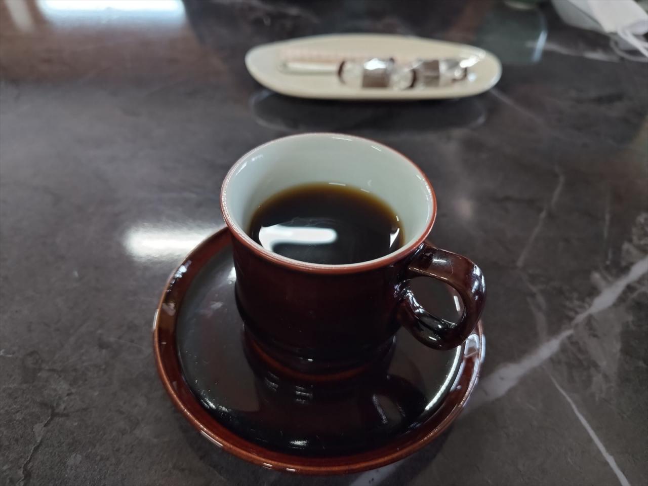 カフェのメニューはスイーツとコーヒーが中心。おとなりサンドを食べてみましたが、抹茶を練り込んだと思われる生地に餡・サツマイモ・生クリームがサンドされ、和のテイストが感じられ、素朴で、それでいてふくよかな味わいでした。