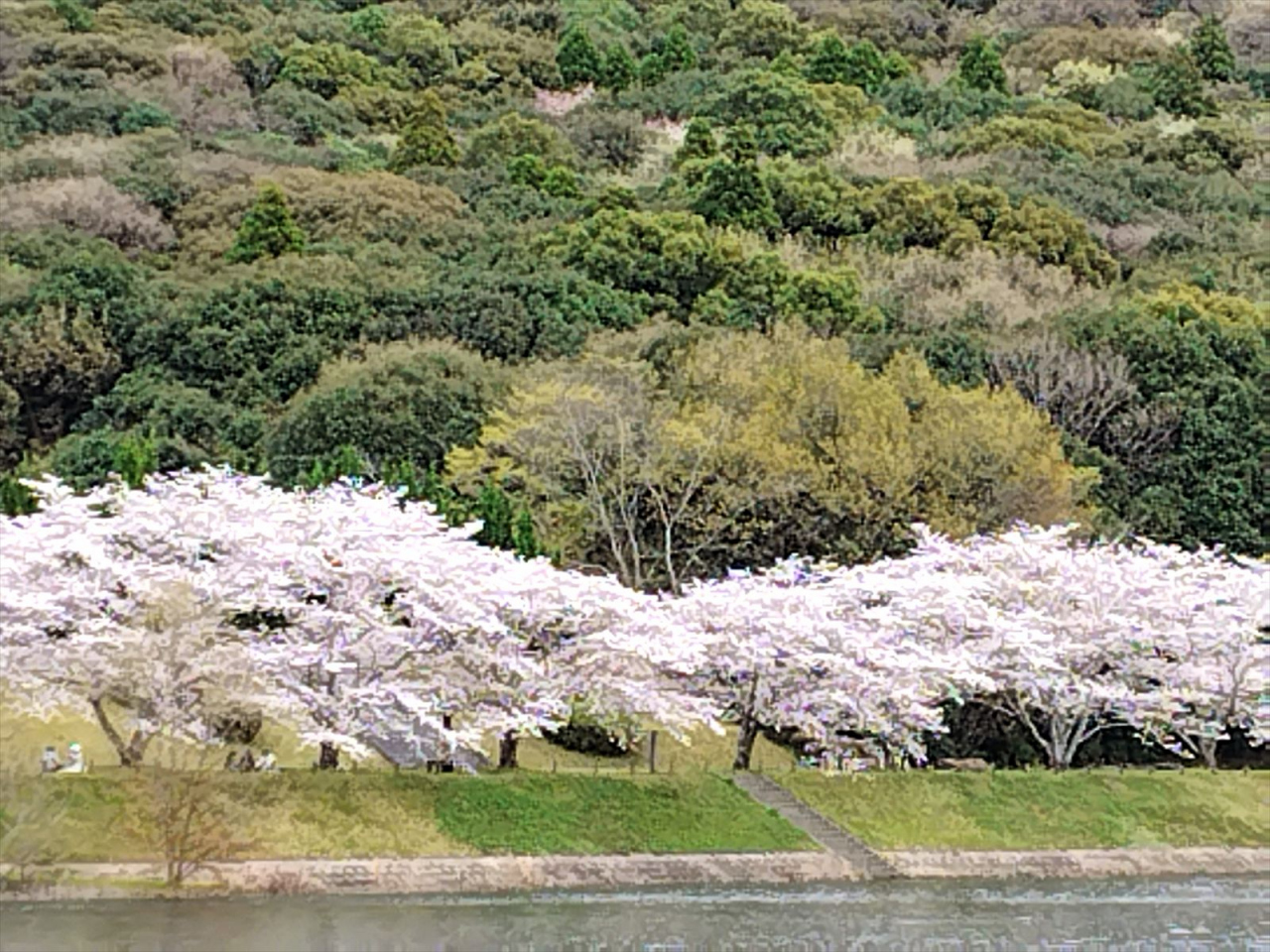 その先、池の北側には駐車場があり、池の岸辺には桜が植えられています。訪れた当日は満開で、花見客でにぎわっていました。水辺で桜を眺めながらお弁当などを広げて食べることもできます。