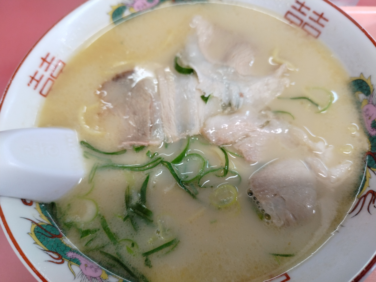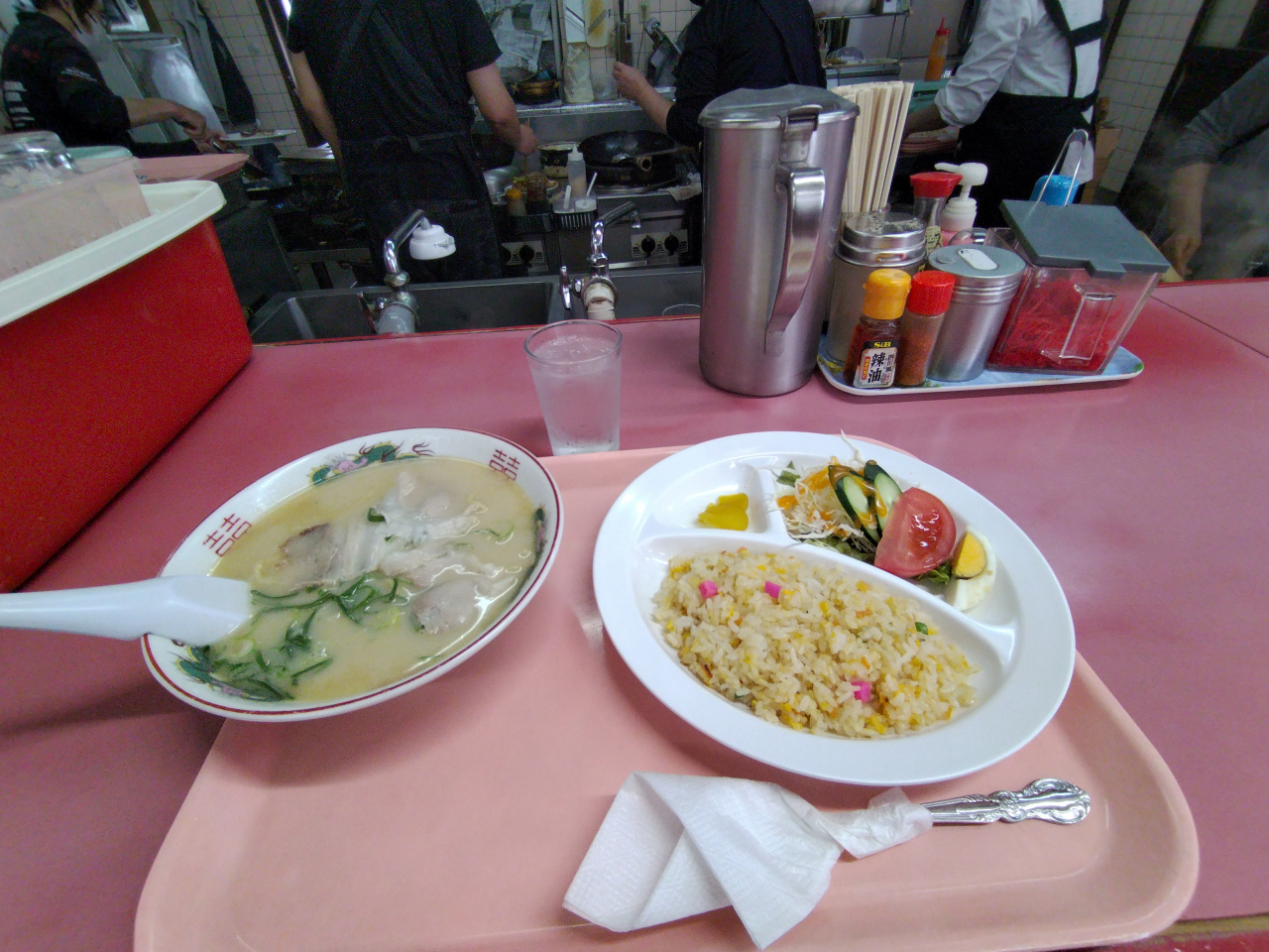 ラーメンセット(豚骨ラーメン+半チャーハン・サラダ)を食べましたが、ラーメンは昔懐かしい、豚骨のパンチの効いたスープが特徴。胡椒や紅生姜を入れるとマイルドな味わいに変わるような感じがしました。セットのチャーハンは、ラーメンとは対照的に薄味でしつこさもなく、ラーメンと併せるとうまくバランスがとれているような感じでした。