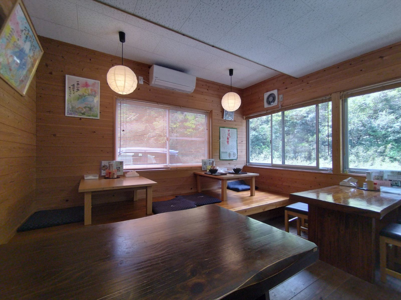 お店はテーブル席、カウンター席、小上がり席(フローリング)とあります。小上がり席には五つの座卓の中で、三つは掘りごたつ式でした。