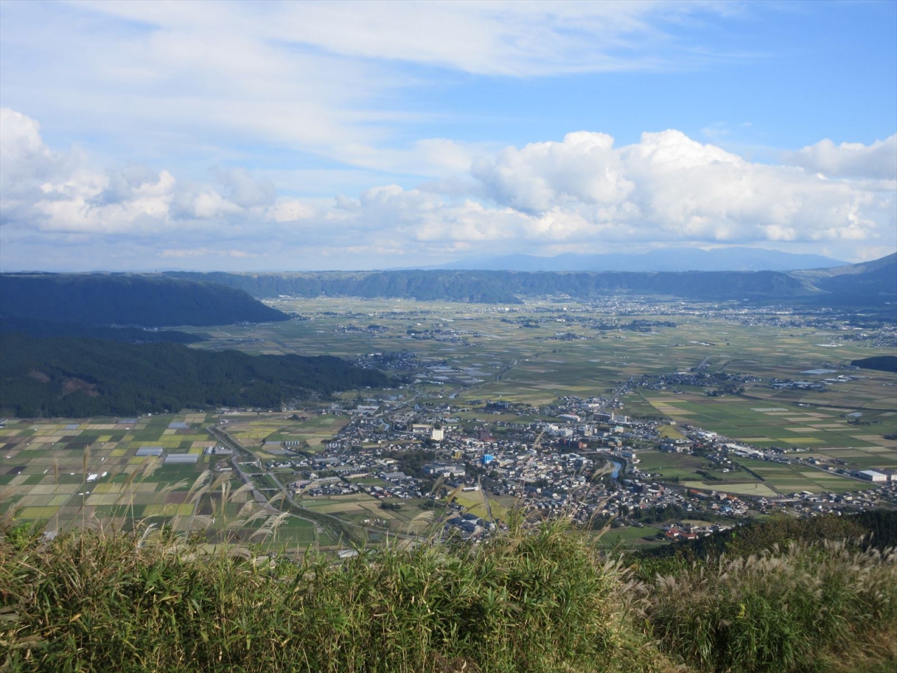 展望台は駐車場から道路を挟んで反対側。眺めはとても素晴らしいです。外輪山から内牧方面、その先に阿蘇五岳の雄大な景色が見えます。