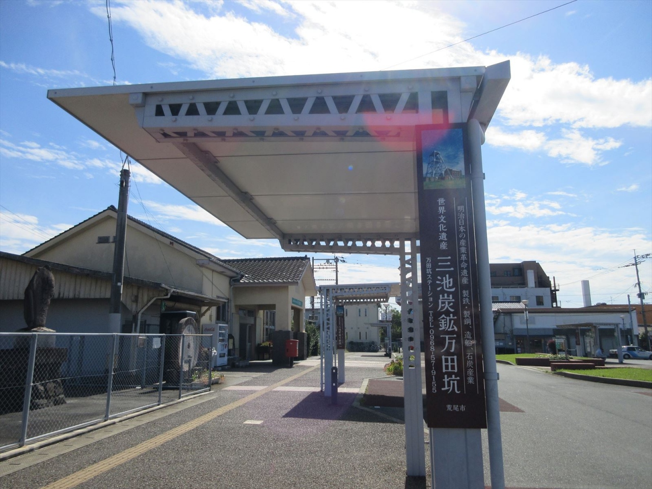 また駅から北方向に少し歩くと三池炭鉱専用鉄道敷跡(世界遺産)があります。ここから万田坑(世界遺産)まで鉄道跡を歩いていくこともできます(万田坑方面に行くには、駅の北側の踏切を渡って駅東側からアプローチした方が良いと思います)。
