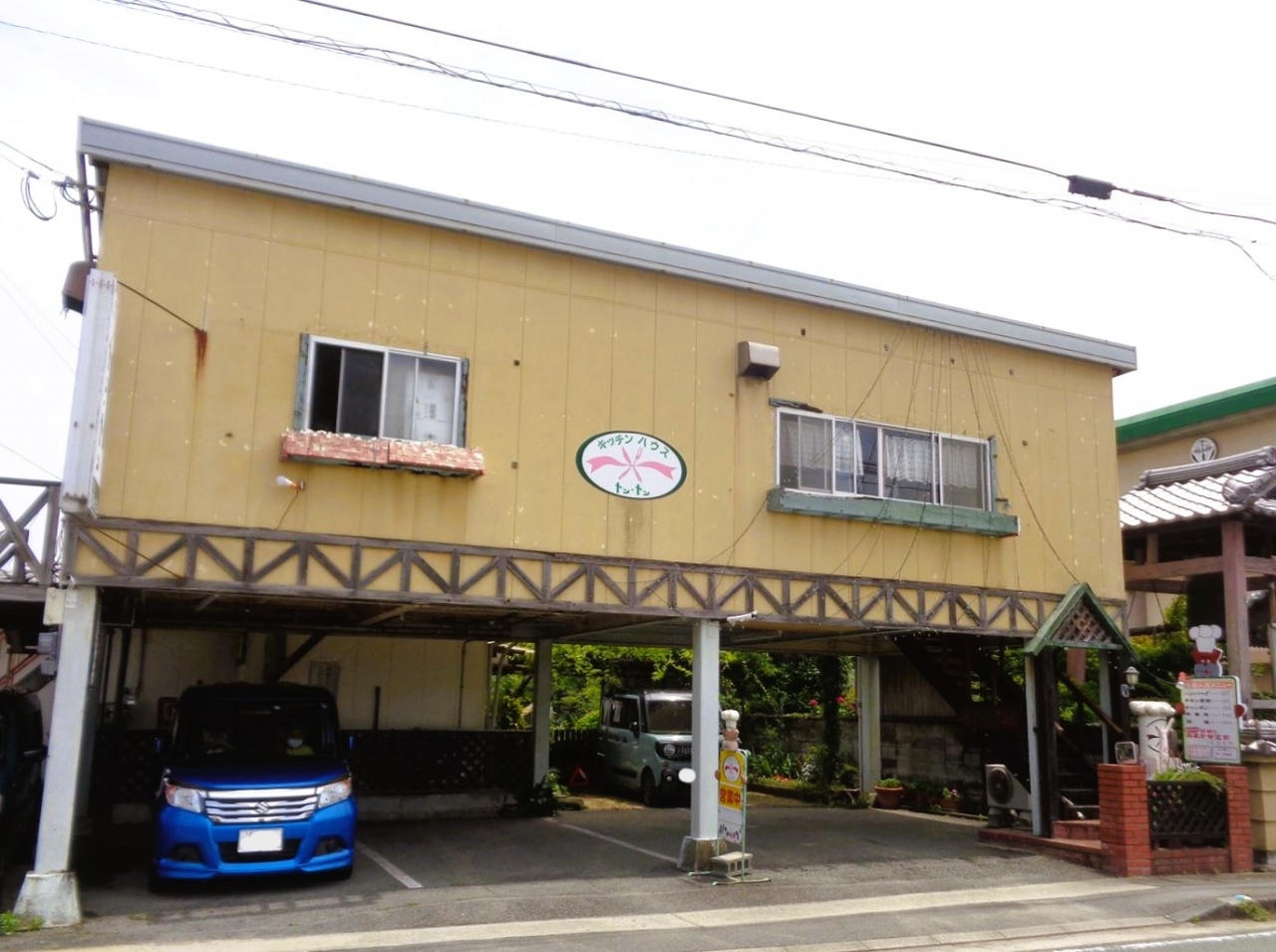 住宅街の中を走る道路に面して、一階が駐車場。二階の店舗には外階段で上がりますが、割と上りやすい階段でした。