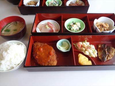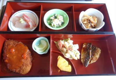 その日替わりランチは二重の箱で出てきて、広げて食べる形。リーズナブルなお値段(コーヒー付で1000円)ですが、料理はきちんと手をかけて丁寧に作られたことがわかるものでした。特にメンチカツはジューシーで、ソースも美味しいものでした。また小さいながらもお刺身も付いていて、みそ汁も具だくさんでした。