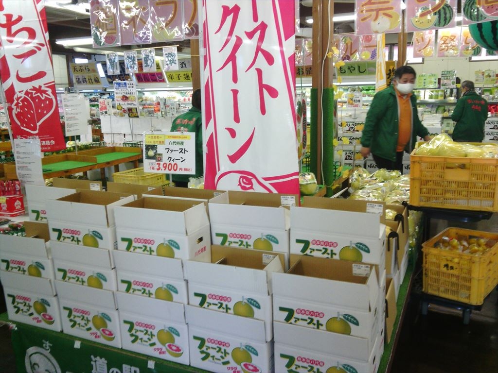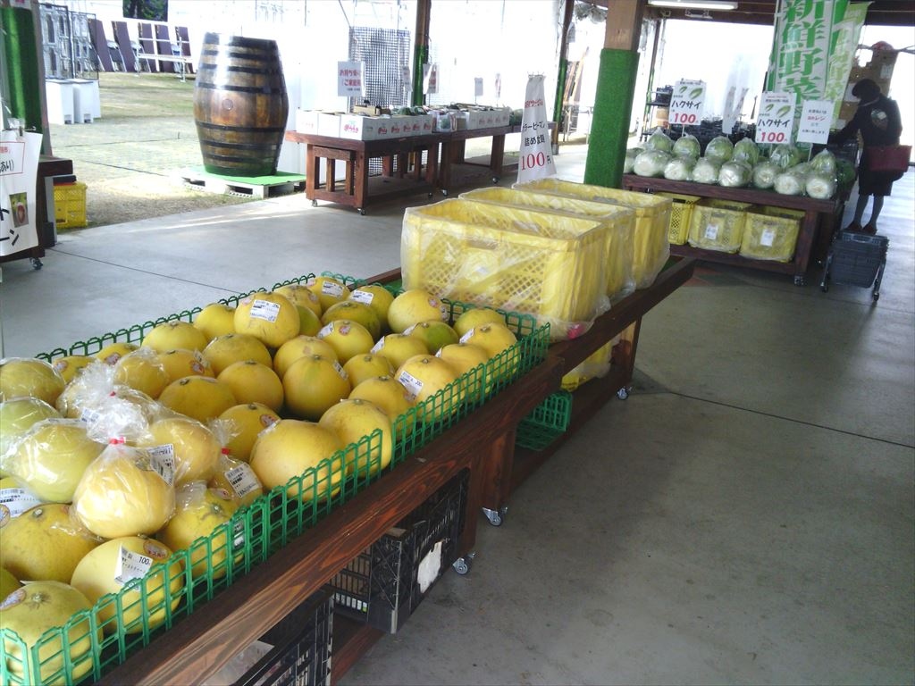 物産館の中には土産物や野菜売場もありますが、フルーツの産地・植木を象徴するように、果物がメインです。すいかが一番の名物だと思いますが、それ以外にもメロンや冬季には柑橘類も数多く出ています。どちらかというと贈答品的な質の良いものをメインにしているようです。