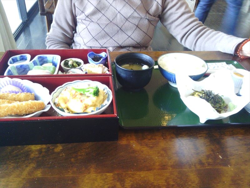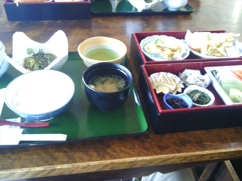 御膳メニューは、ワゴンで運ばれてきて、ご飯、味噌汁、茶そば、茶わん蒸しが一つのお盆に乗り、おかず類は二段の箱に入っていて、見た目も工夫してあり楽しめました。