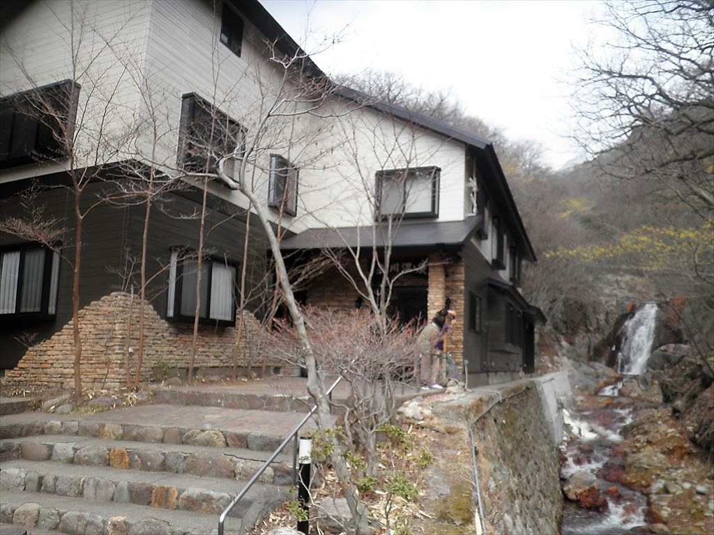建物は竹田方面から久住高原へ抜ける道路から入り、一本道ですがちょっと距離があります。登山客の駐車場もすぐ近くにある施設でまさしく山の中です。建物のすぐ横に渓流があり、その奥に滝があります。