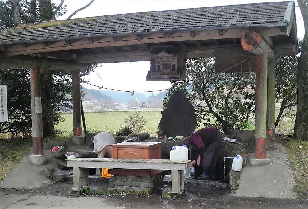 以前は水源池で水を汲んでいた記憶がありますが、今はカフェ兼売店の「がまだす堂」の横で汲むようになっている…そうですが、凍結でポンプ故障中とのことで、駐車場下の共同の水汲み場で汲んできました。