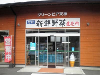 横に長い建物で、正面から見て左側にローソン、右側に農産物直売所の「グリーンピア天神」、その間にトイレや休憩スペースが設けられています。