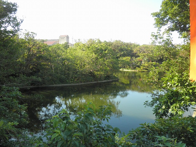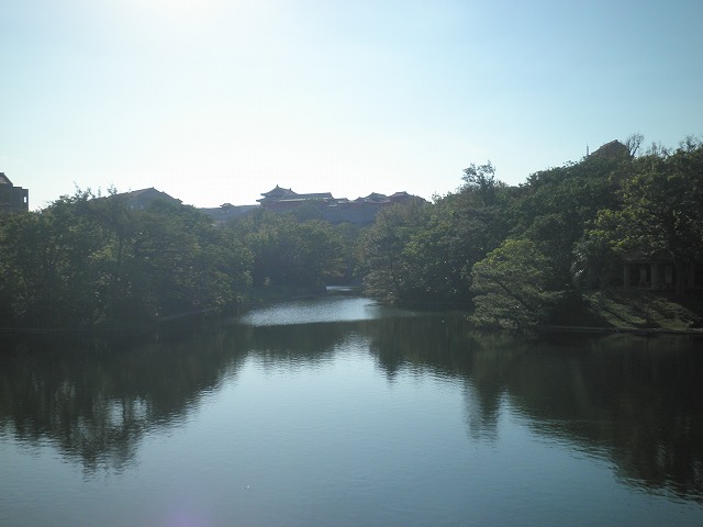 そうすると…以前とはまったく違う景色が見えました。南側(城側)から見えるのは狭くなっている部分で、ごく一部分しか見えませんが、バス通り側からは広々とした湖面と鬱蒼とした森が見え、その奥に一際高い場所に首里城が見えます。実に開放的で気持ちの良い景色でした。