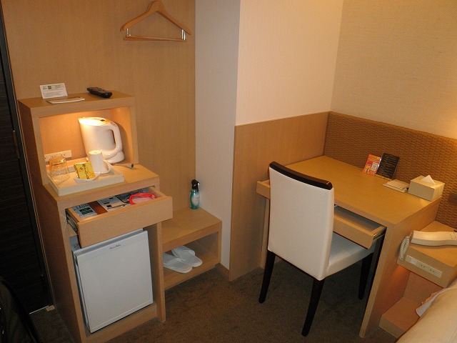 ベッドとデスクは、入口のすぐ側にあるので、気になる方は、あまりくつろげないかも知れません。ベッドは140cm幅で、ゆったり休むことができました。デスクは小さ目ながらもしっかりしたものです。