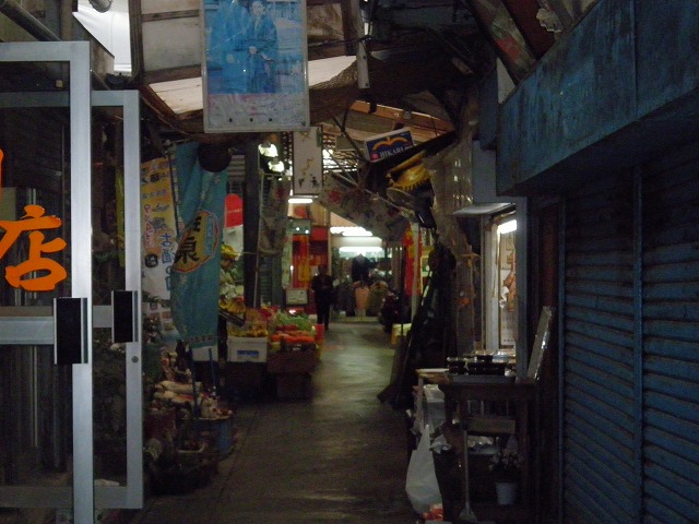 国際通りから入って、商店街の右側はガーブ川の暗渠の上に建てられた、通称水上店舗でで、その反対側は「市場本通り」になります。