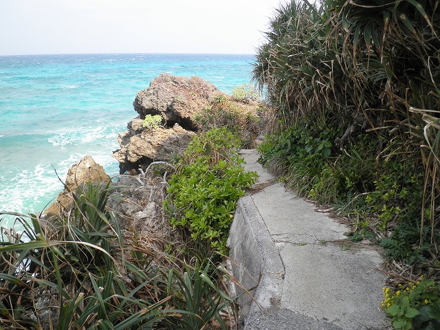 カラフルな標識にしたがい進むと、コンクリートの階段が海際の崖に沿って下りて行きます。それゆえ、絶景で自然の雄大さを感じられる場所でもあります。
