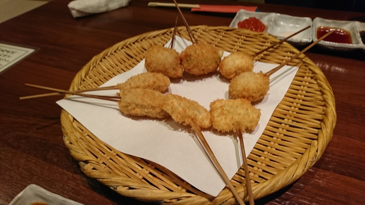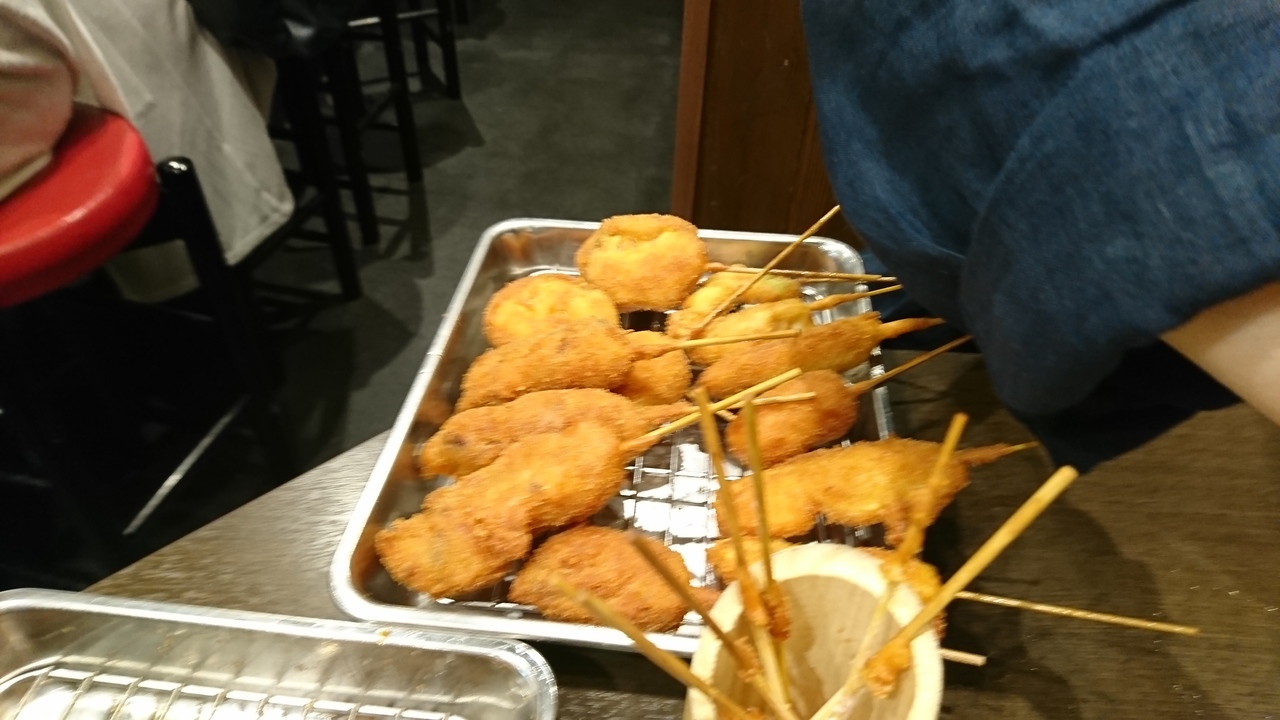 大阪観光の夕食に訪れました。串カツを大阪で食べるのはこれが初めてで、店内の注意書きには「ソース2度漬け禁止」の文字が。