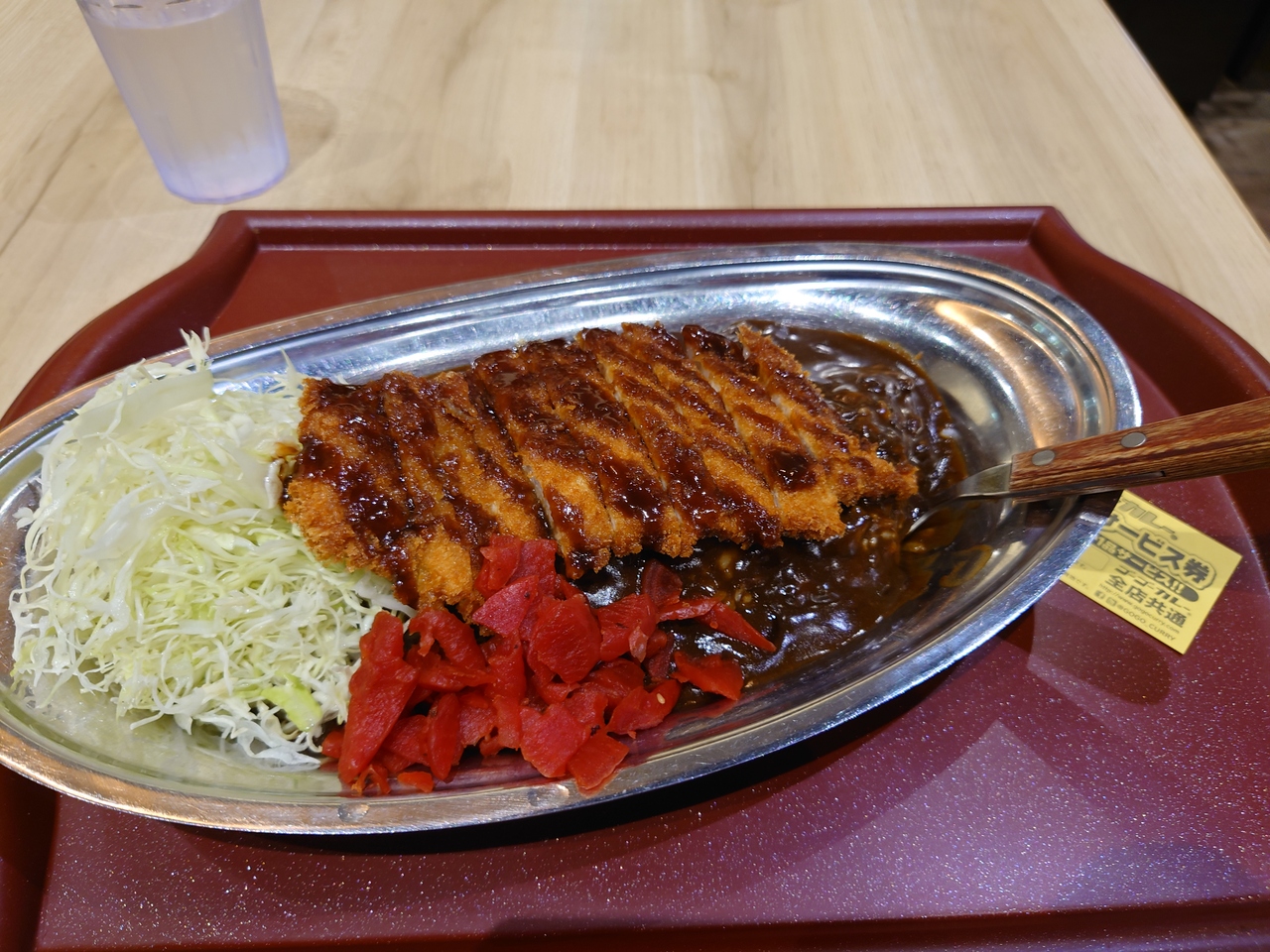 チェーン店なので特別どうこうということはありませんが、ドロッとしたコクのある黒いカレールーにサクサクの薄切りカツ、箸休めにもってこいのキャベツの千切りは食べごたえ十分でした。