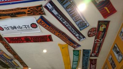 小さなお店で、テーブル席が4席ほど。壁や天井にはJリーグのチームのタオルやユニフォームがたくさん飾ってあります。