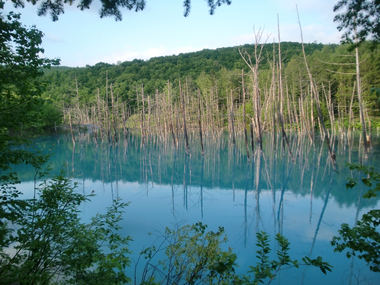 池は青白い色をしていて、十二湖の青池とはまた違った青色をしています。