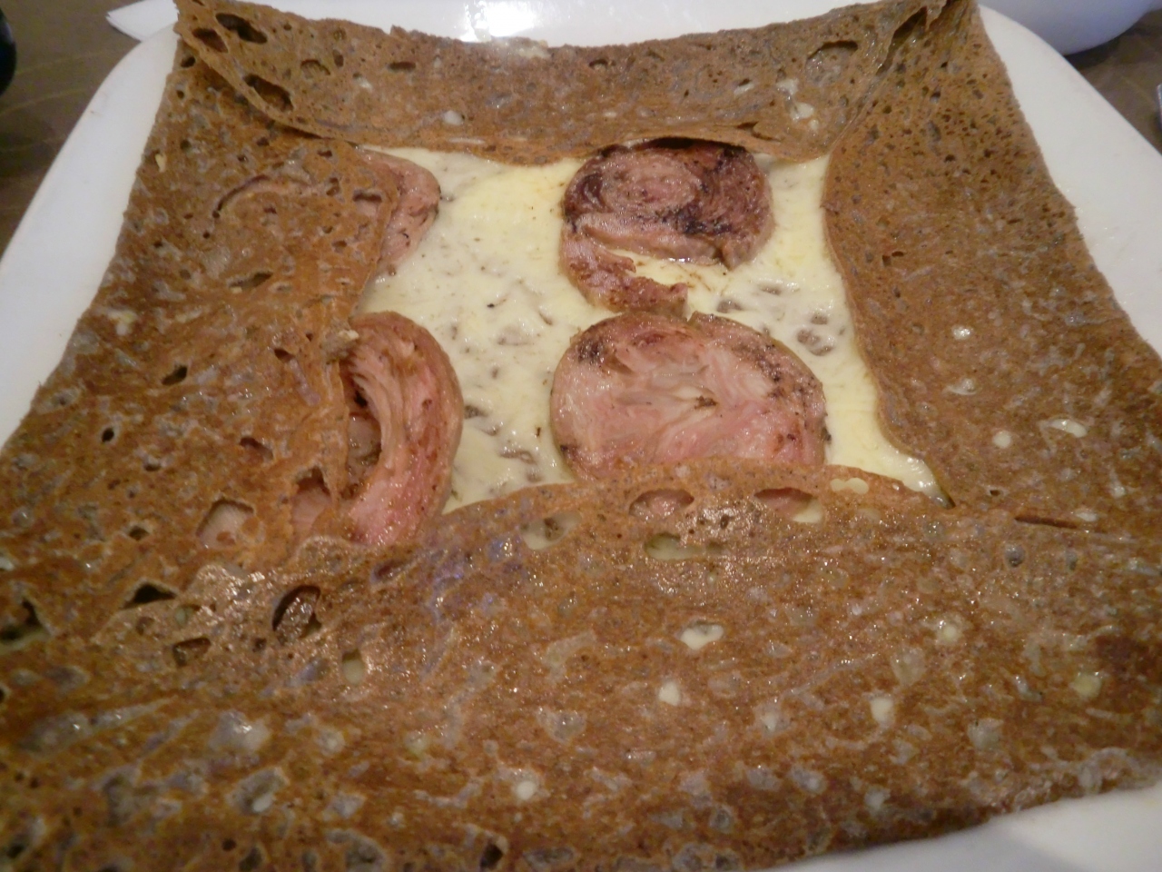 サンマロの城壁内にあるクレープリー「ラ・ブリガンティーヌ」は、常にお客さんがいる人気店。私はアンドゥイユ(豚の腸詰)のガレット(6.8ユーロ)、嫁はトマトとチーズのガレット(5.8ユーロ)を注文しました。アンドゥイユはクセがあるモノで、動物性の香りとガレットの蕎麦香りがマッチングした堪らない一品でした。トマトとチーズはクセは無く、日本人なら殆どの方が「美味しい!」と言わせる一品に仕上がってました。