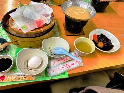 想像通り温泉旅館の食卓形式の色々な料理を小盛した物、夕食なので酒が欲しいと思っていると添乗員から「ここはクーポンを使えません。現金で前払いしてください!」と叫ぶ声。
