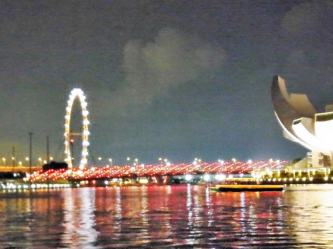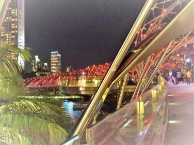マリーナ・ベイ一周のため昼間この橋を渡った時には、結婚衣装を着た二組の新婚さんがマーライオンをバックに写真を撮っていました。- 旅行時期