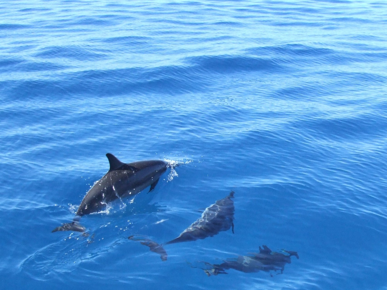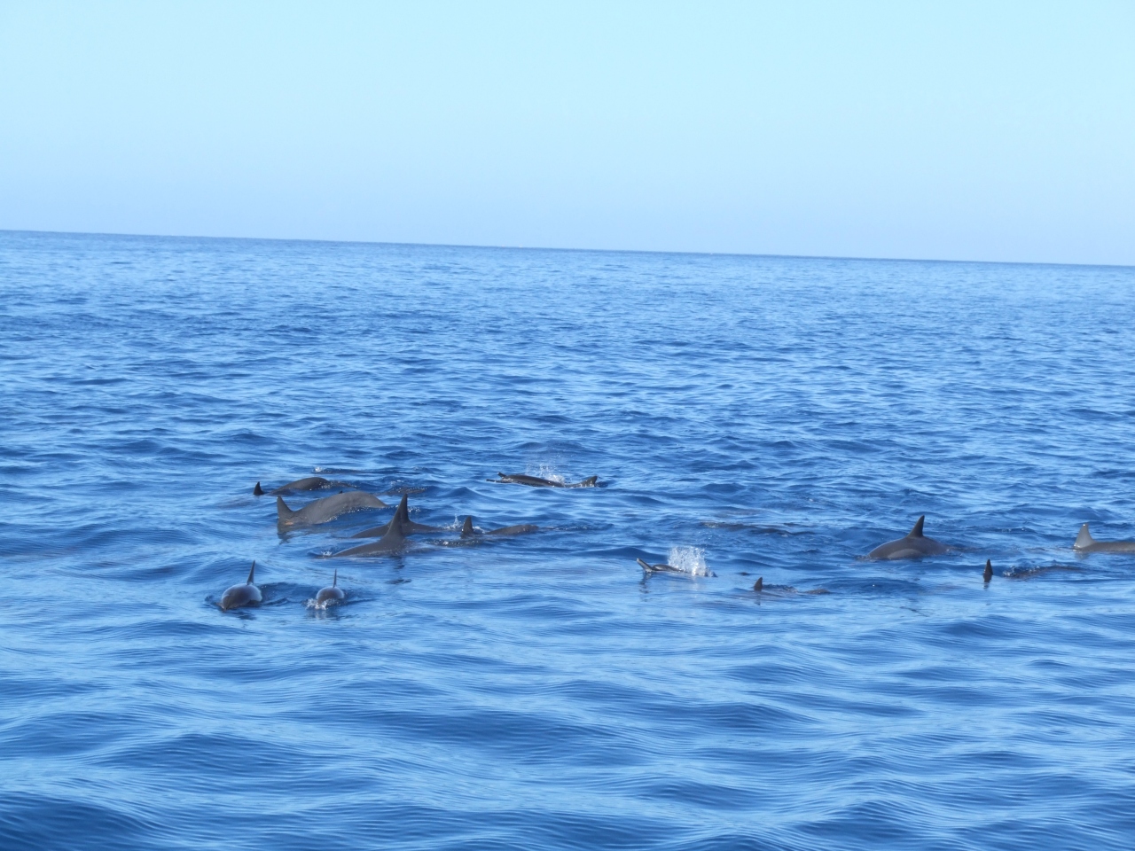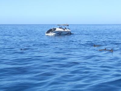 イルカが群れを作り集まる場所が決まっているようで、そこに着くと多数のイルカを見ることができました。中には船と併走では無く併泳するイルカもいます。