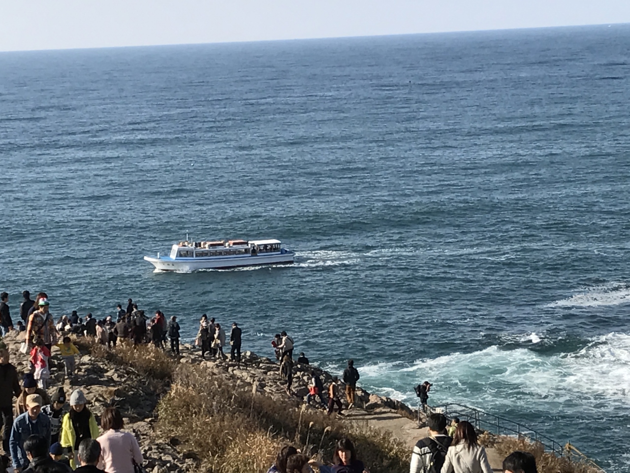 オプショナルツアーを利用。乗船後、2F船首に陣取っていたが、外洋に出たとたんにスピードを上げ進み出します。当然、揺れは大きく立っては歩けなくなります。