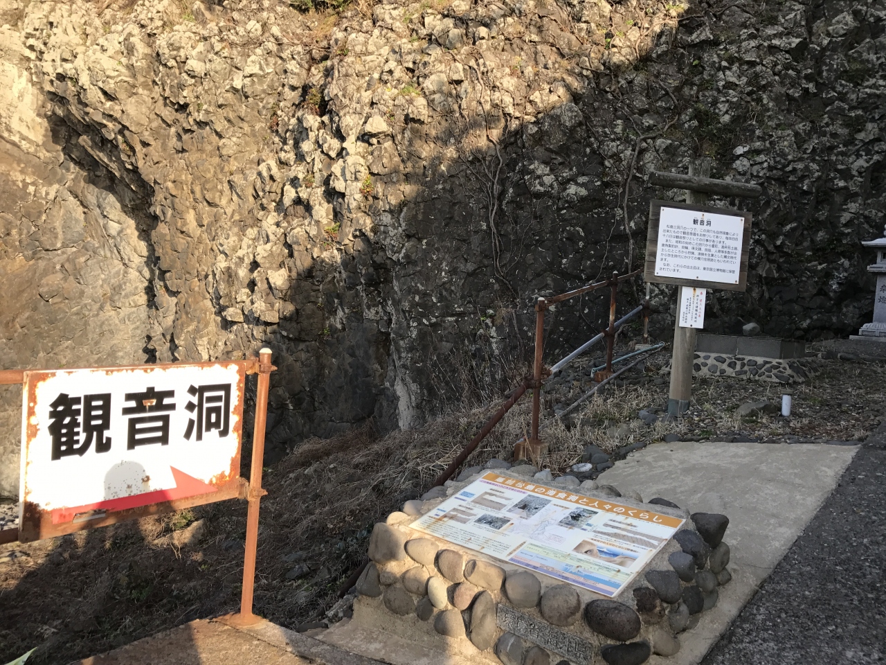 観音洞からは、人骨、貝殻、土器などが見つかり(これらは東京国立博物館に保管)、縄文時代から弥生時代にかけての横穴住居跡と言われています。