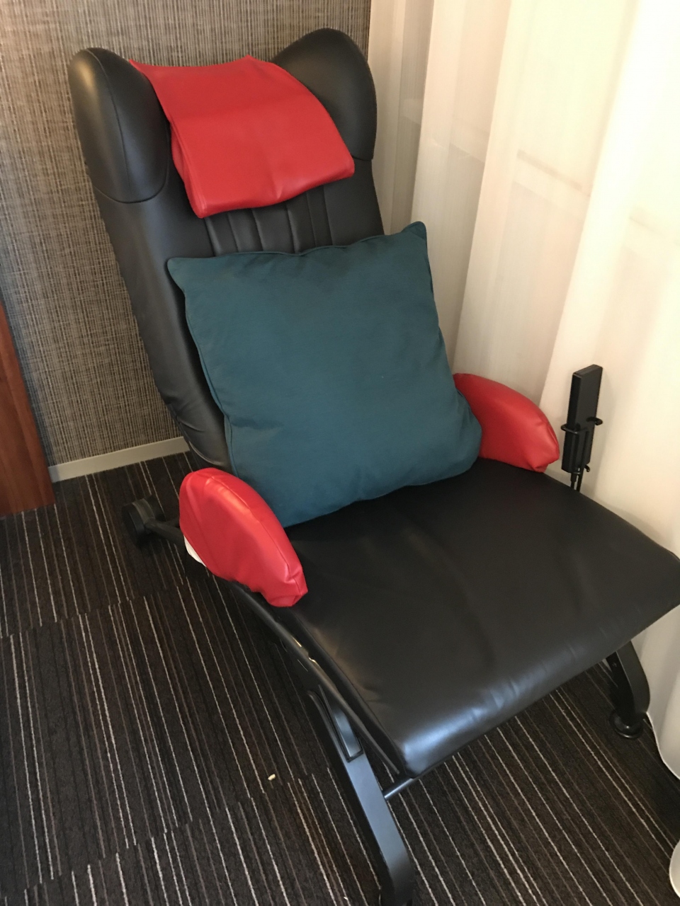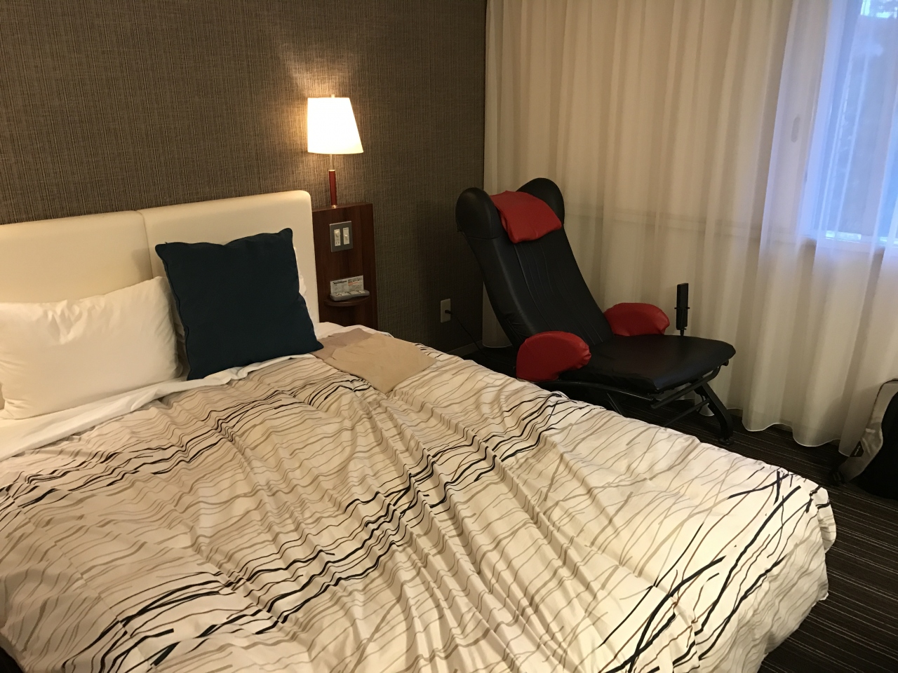 部屋が狭い。そこにマッサージチェア、加湿器が置かれて余計に狭くなっている。ダブルベッドも狭い。