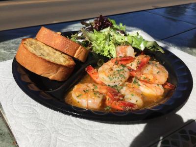 どうにか座れた頃にガーリックシュリンプが運ばれてくる。エビの皮が取られ背から包丁が入れられ背わたも除去されている。エビはオワフ島で養殖していると聞いたが現地の方がこの作業を行っているのだろうか?