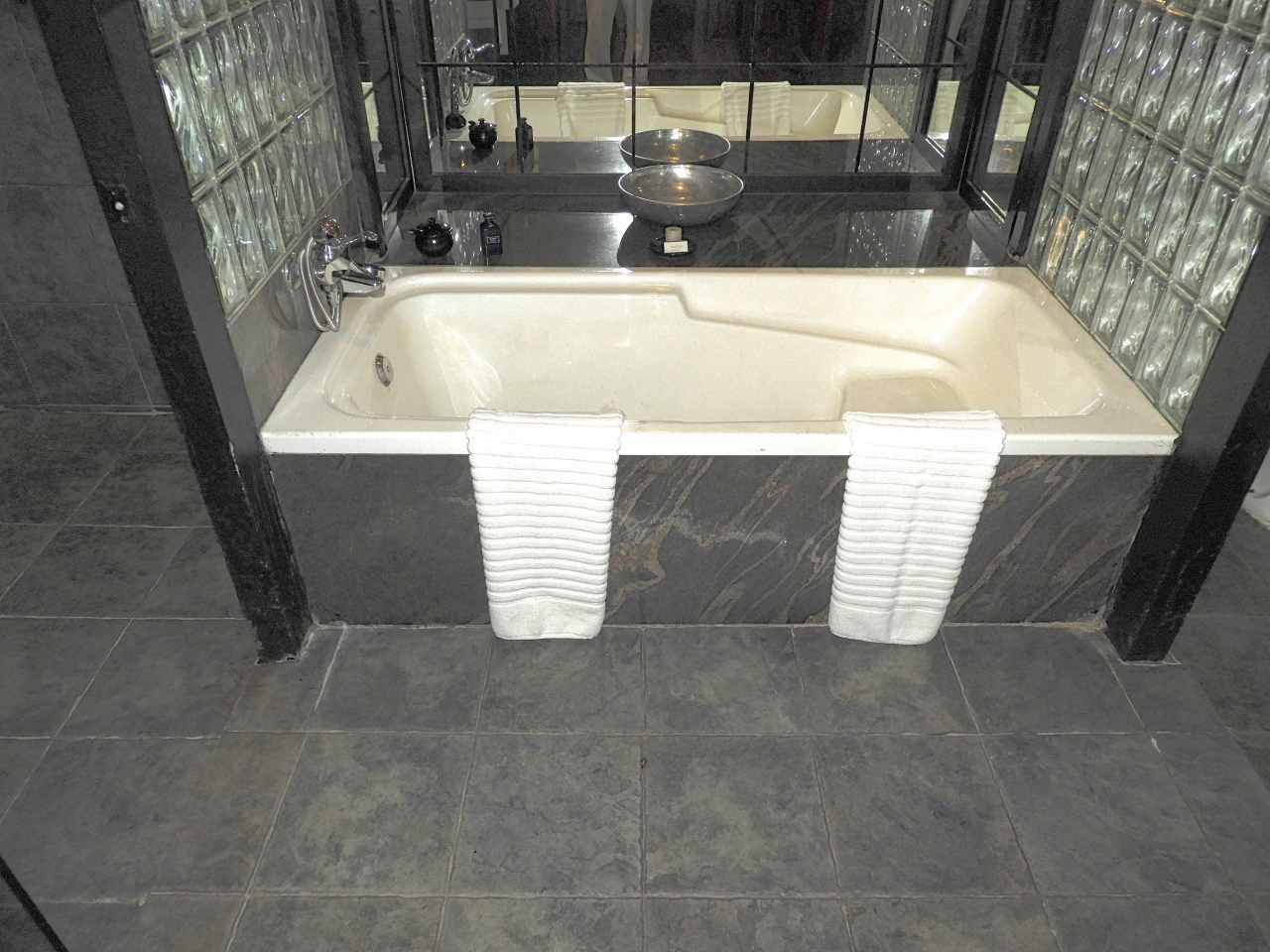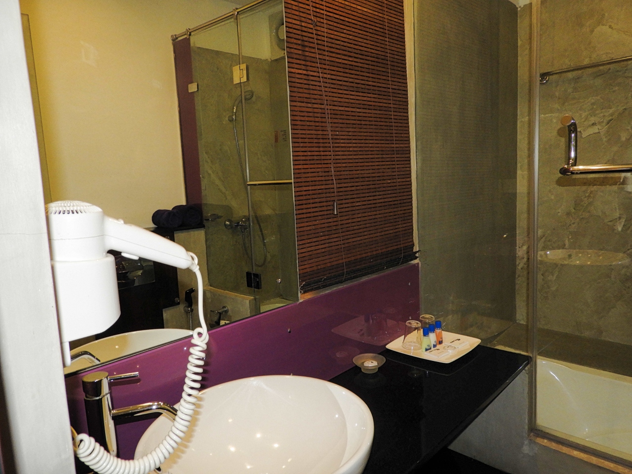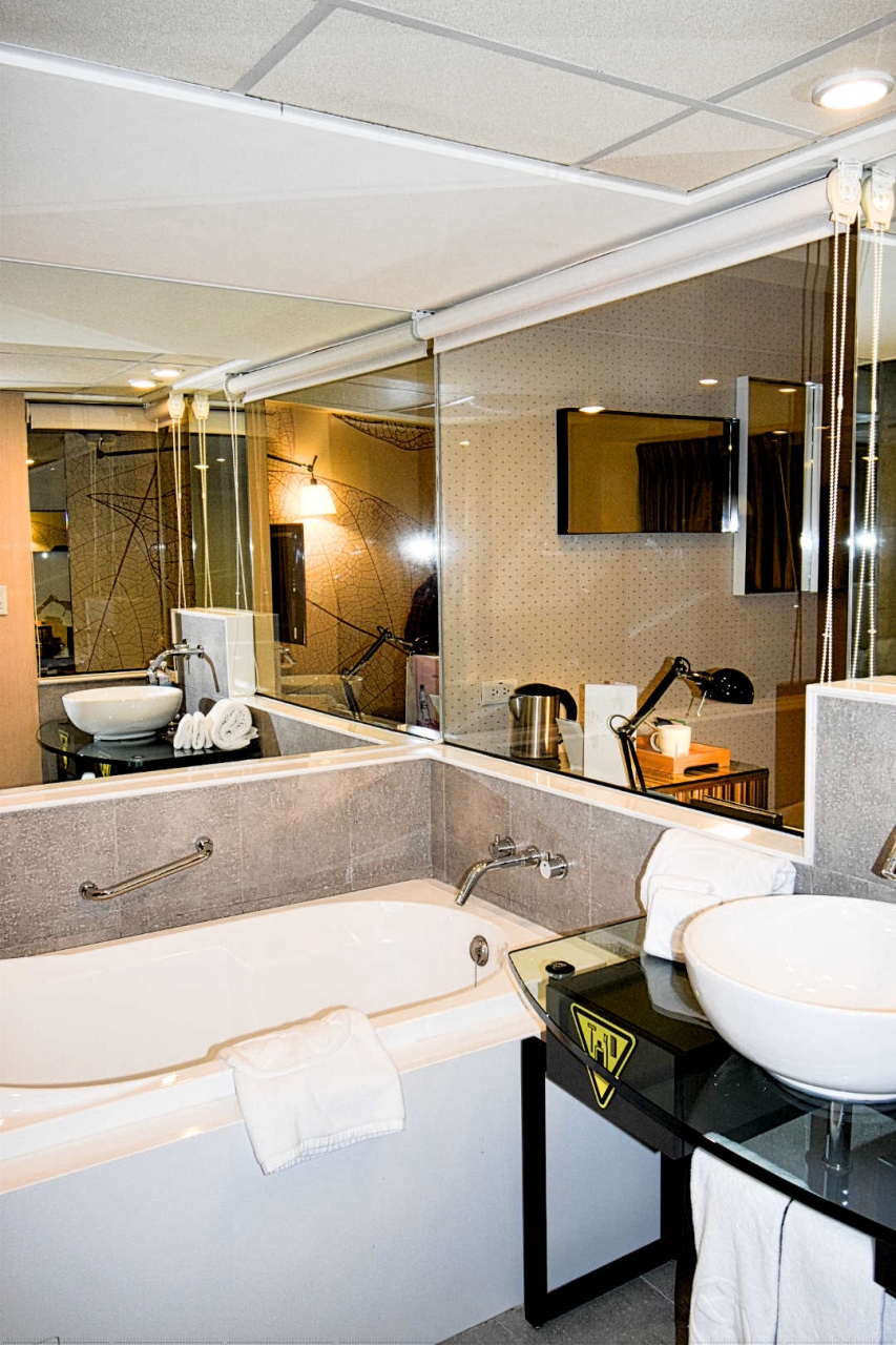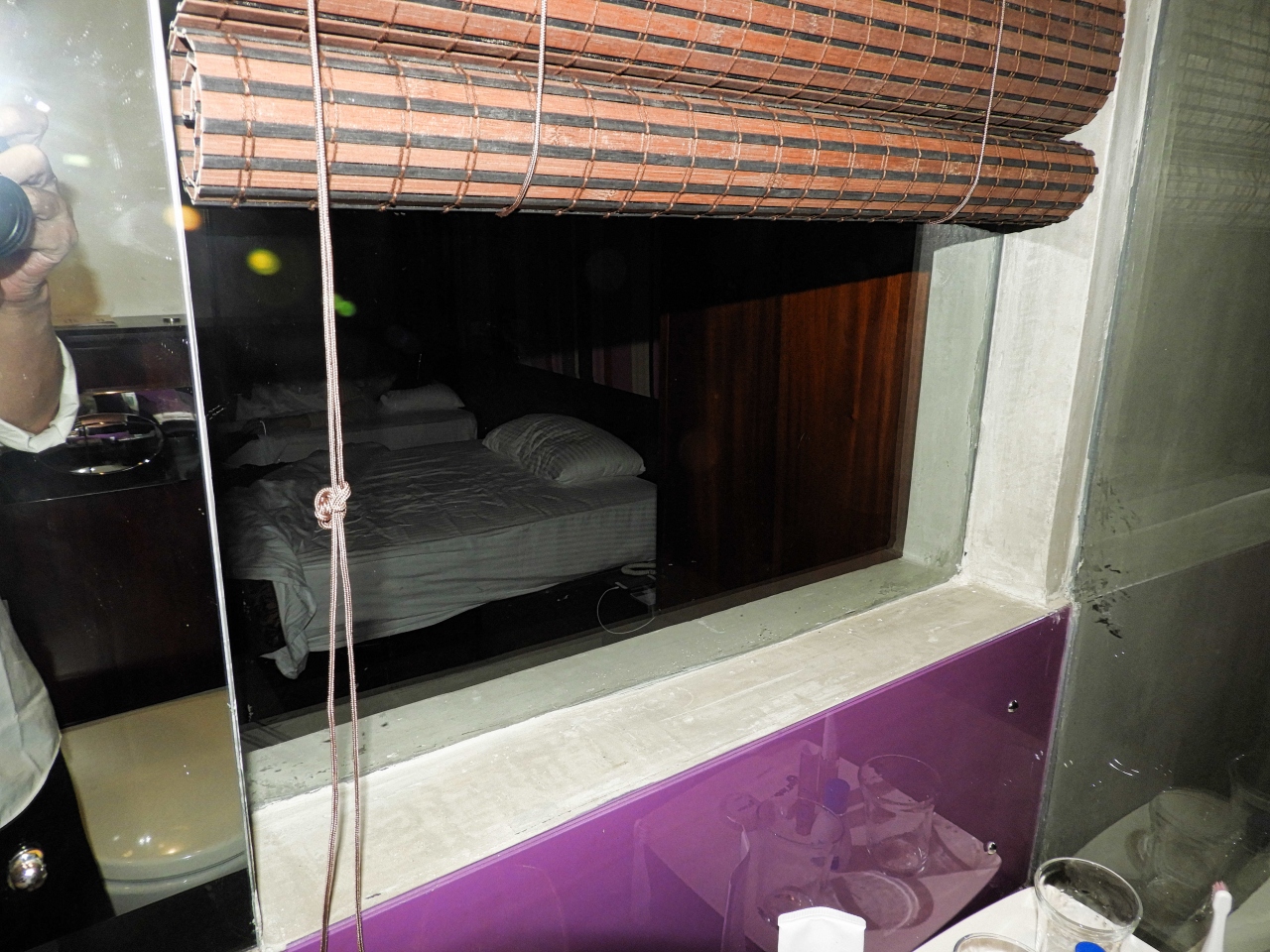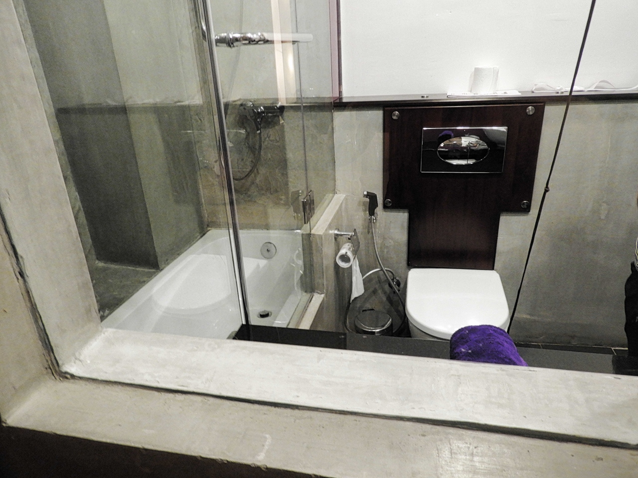 この部屋のバスルームは透明ガラス、そして窓のカーテンを開けると道を挟み隣のビル。露出狂で無い方は要注意!!- 旅行時期